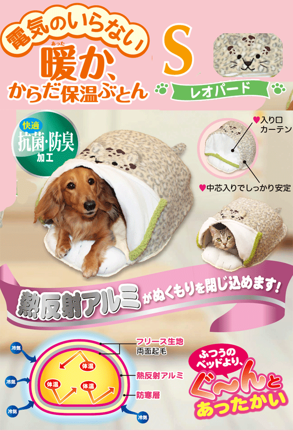 からだ保温ぶとん S レオパード 電気のいらない暖か、からだ保温ぶとん レオパード S 2015秋冬 かまくら型ベッド あったか ペット用ホットカーペット 犬猫用ヒーター 節電 エコ商品 ドギーマンハヤシ 犬猫用 サイズ からだ保温ぶとん S レオパード 電気のいらない暖か、からだ保温ぶとん レオパード S 2015秋冬 かまくら型ベッド あったか ペット用ホットカーペット 犬猫用ヒーター 節電 エコ商品 ドギーマンハヤシ 犬猫用 材質 生地:ポリエステル パイピング:ポリプロピレン 中綿:ポリエステル(滑り止めにPVC使用) 天面用保温シート:アルミ、ポリエチレン、ポリエステル 底面用保温シート:アルミ、ポリエチレン 中芯:ポリエチレン 保温シート(底面):アルミ、ポリエチレン メーカー ドギーマンハヤシ 暖房 器具 マット 安全 電気代 留守 温度 猫用こたつ 寒さ対策 猫用ベッド 犬用 ベッド床材 正規品【ホワイトデー お返し sale スーパーセール】【おすすめ】【オススメ】【母の日】【父の日】【敬老の日】【プレゼント】【通販】【ボーナス特集】暖か、からだ保温ぶとん レオパード 《S》 寒がりの愛犬、愛猫のための保温力の高い機能性寝具(ペット用ベッド)です。